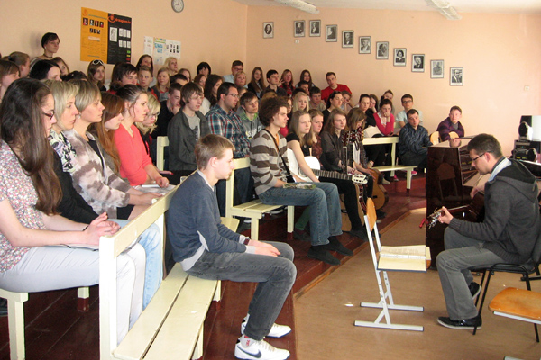 3.maijā plkst. 12.00 mūzikas kabinetā mēs, interesenti: no 8-12. klasei un skolotāji, satikāmies ar latviešu dziesminieku Dināru Gulbi un viņa draugiem, starp kuriem bija arī Austrasbērni, lai runātu par Imantu Ziedoni , lai runātu un izdziedātu Ziedoņa dzeju.